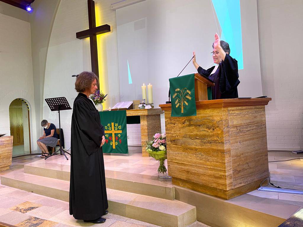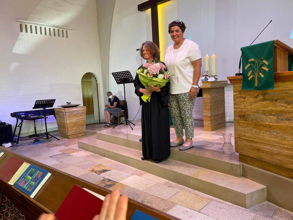 Während des Gottedienstes am Sonntag, den 27.06.21 wurde Pfarrerin Dorothea von Mitzlaff durch Dekanin Schneider-Cimbal von ihren Aufgaben in der Johannesgemeinde entpflichtet.In dem ansprechenden Gottesdienst predigte Pfarrerin von Mitzlaff zum Thema „Wie kann Versöhnung gelingen“. Susanne Grimm und Saskia John sangen begleitet von unserem früheren Ältesten Rolf Hensel, der extra aus Darmstadt gekommen war. Die Vorsitzende des Kirchengemeinderats, Nicole Rüegg, bedankte sich im Namen der Gemeinde für die tolle Zusammenarbeit, die innovativen Ideen und das Engagement für die Kinder- und Jugendarbeit.